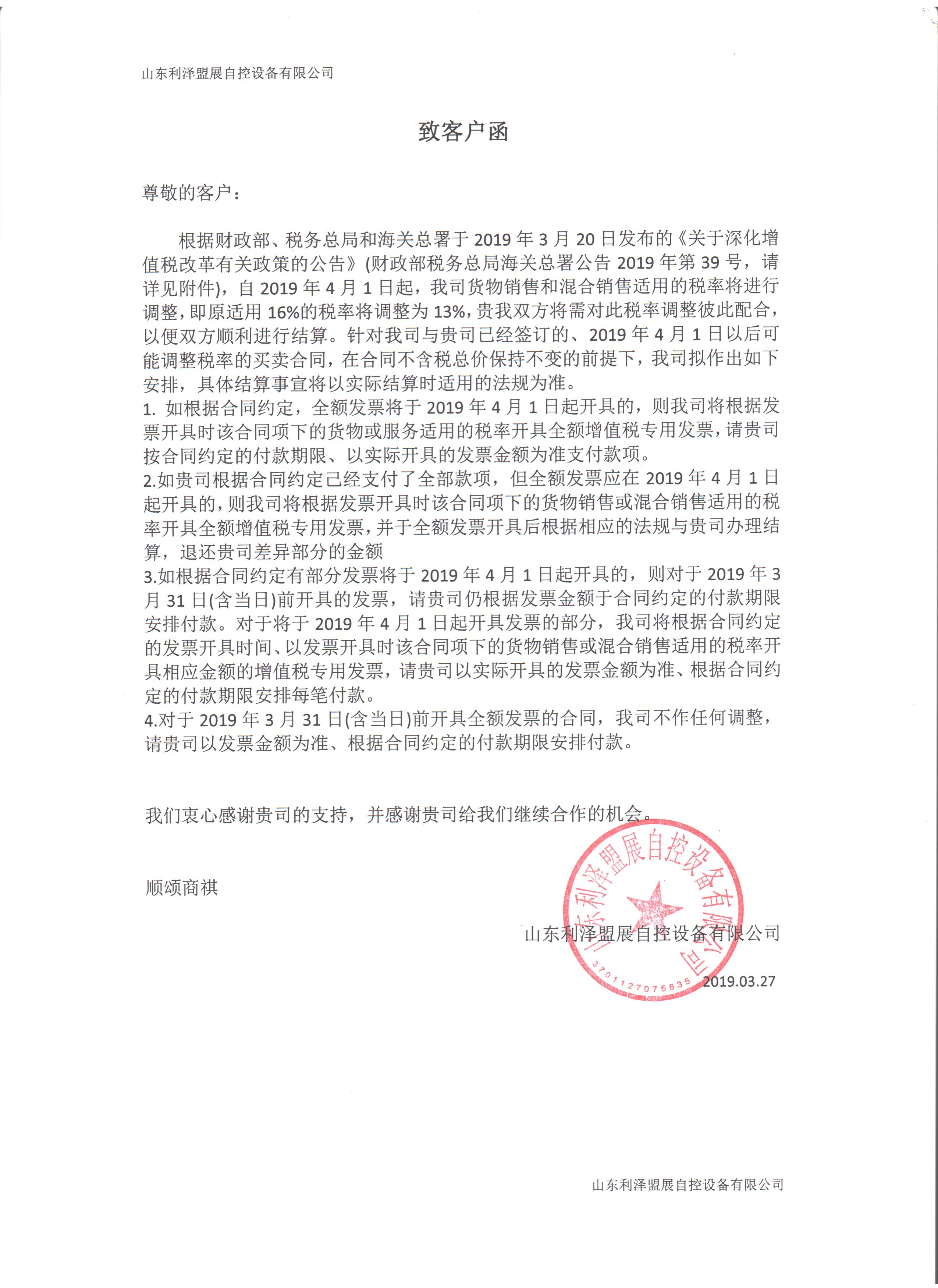 山東利澤盟展自控設備有限公司2019因稅率下調致客戶(hù)函