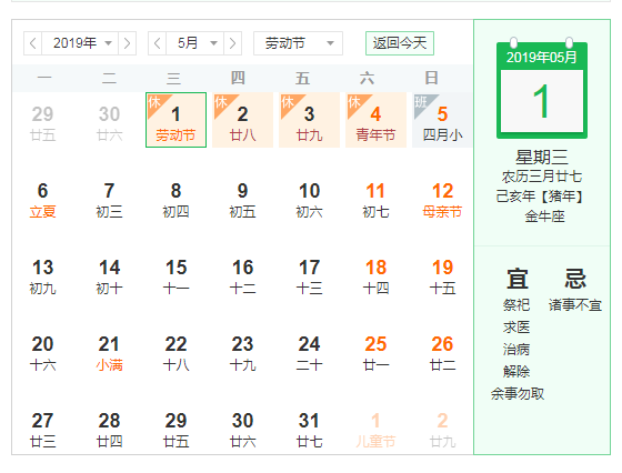 一、2019年5月1日至4日放假調休,共4天。4月28日(星期日)、5月5日(星期日)上班。